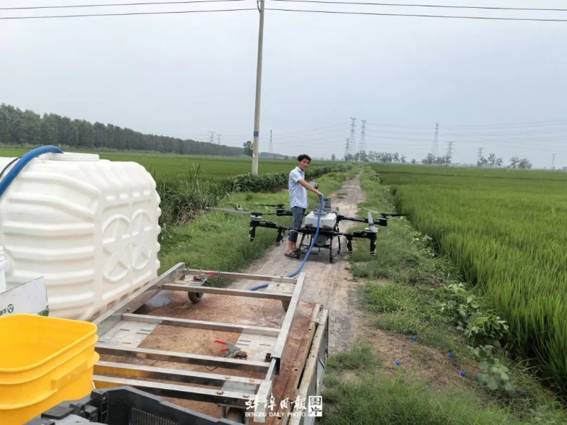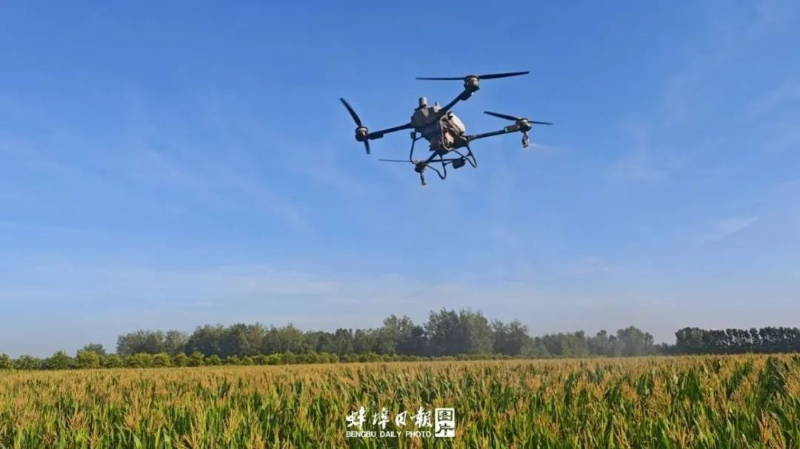 种粮大户洪安选正操作植保无人机,为玉米田开展飞防作业;村民田言扣正使用自走式喷灌系统为水稻田实施精准灌溉;李奈正操作无人机,为村民实施稻田农药喷施作业……金秋八月,正值水稻拔节分蘖、玉米抽穗灌浆、大豆开花结荚的关键农时,蚌埠沫河口镇的田野上呈现一派繁忙景象,一场科技赋能、护航秋粮田间管理的攻坚战正打响。