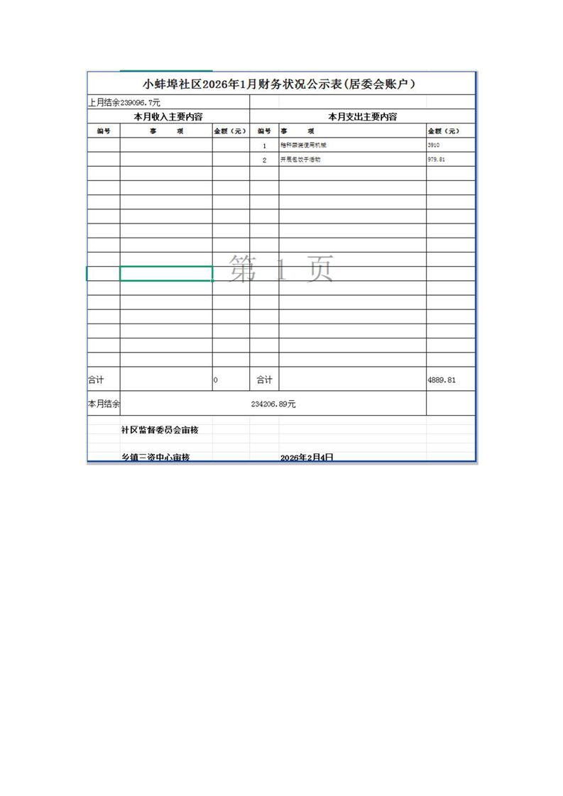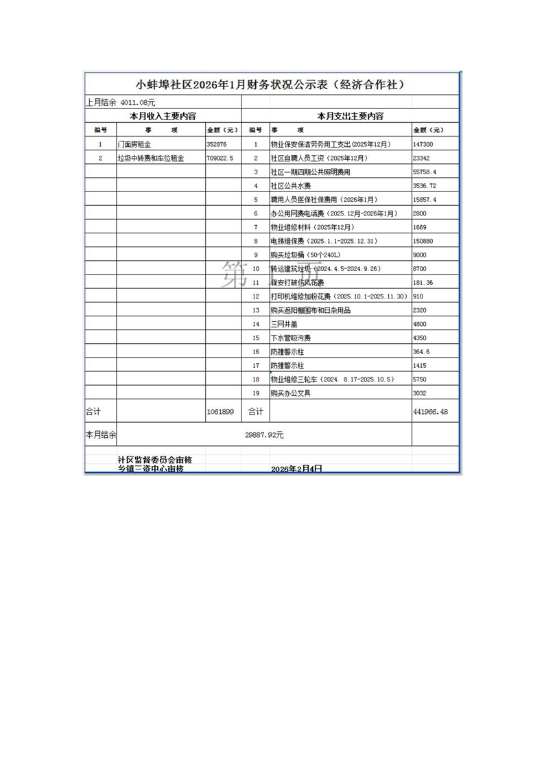 小蚌埠镇小蚌埠社区财务收支明细公开公示表(2026年1月份)