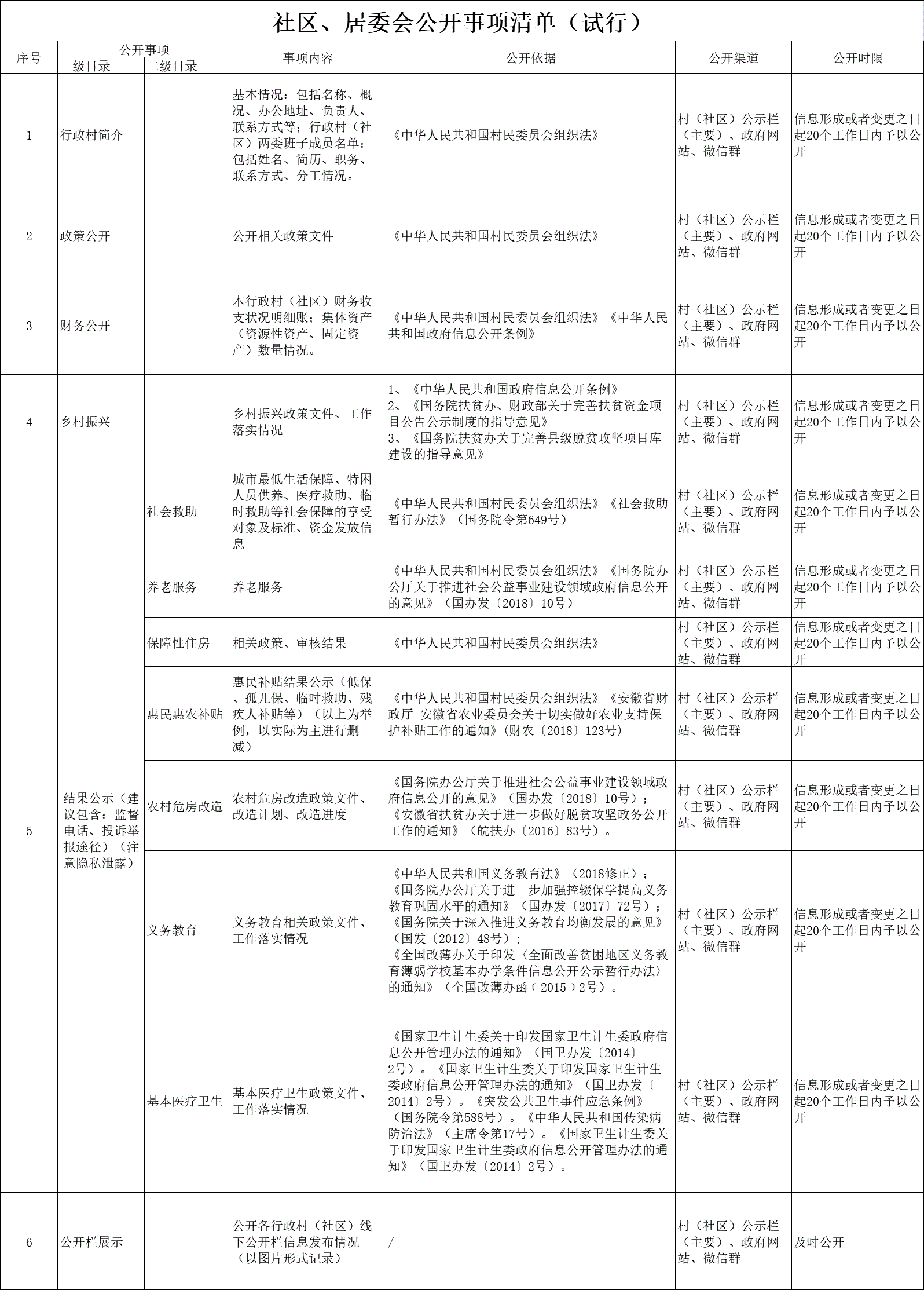 社区、居委会公开事项清单(试行)
