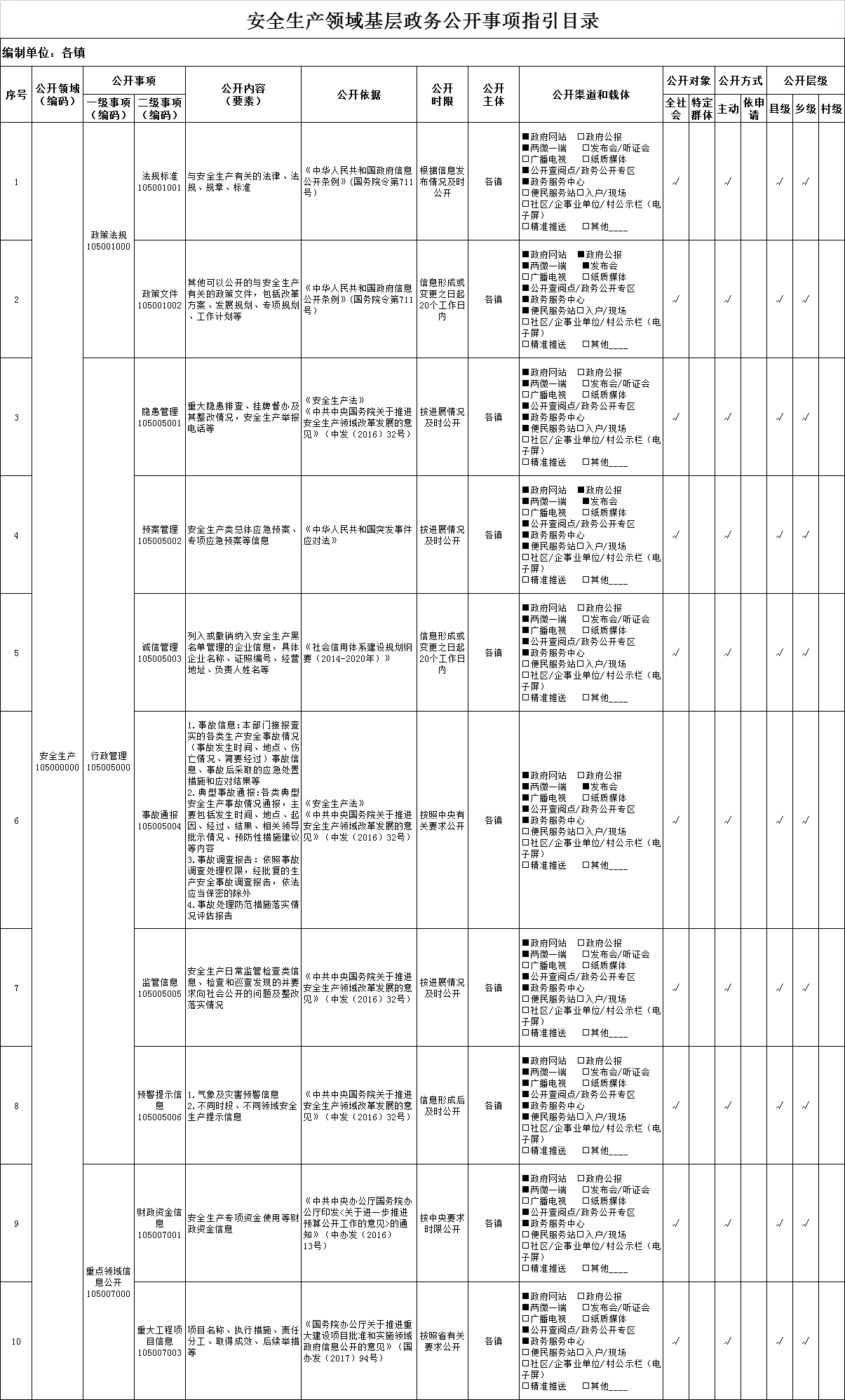 安全生产领域基层政务公开事项指引目录