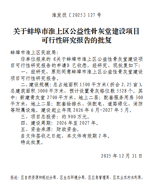 关于蚌埠市淮上区公益性骨灰堂建设项目可行性研究报告的批复