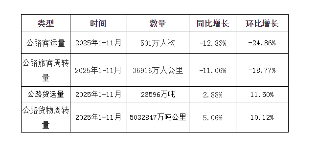 蚌埠市2025年1-11月道路客运及货运运输量统计信息
