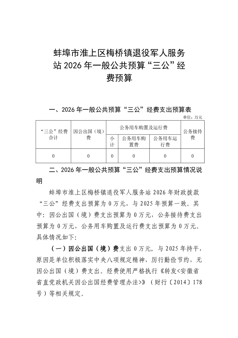 蚌埠市淮上区梅桥镇退役军人服务站2026年单位“三公”经费预算情况