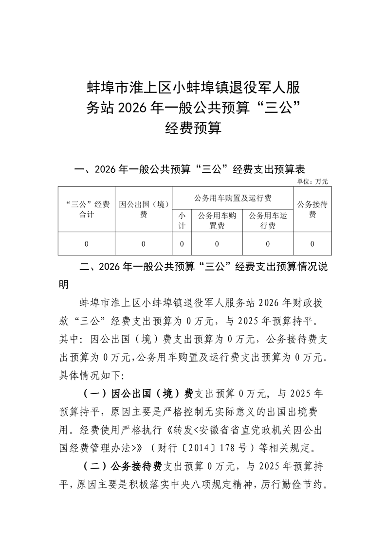 蚌埠市淮上区小蚌埠镇退役军人服务站2026年单位“三公”经费预算情况
