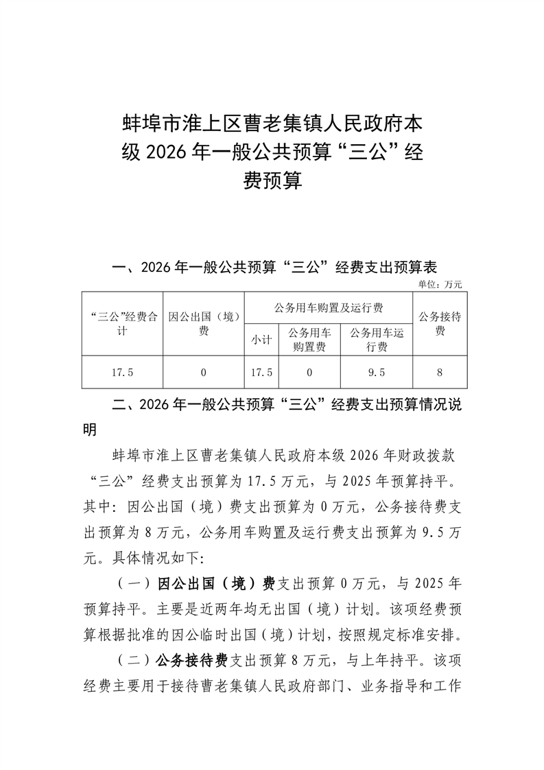 蚌埠市淮上区曹老集镇人民政府本级2026年单位”三公“经费安排情况
