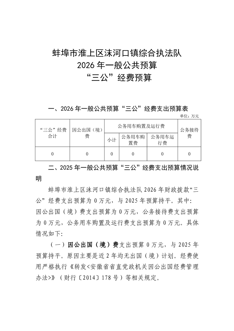 蚌埠市淮上区沫河口镇综合执法队2026年单位“三公”经费预算情况