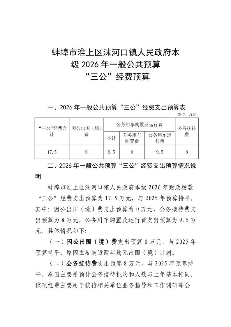 蚌埠市淮上区沫河口镇人民政府本级2026年单位“三公”经费安排情况