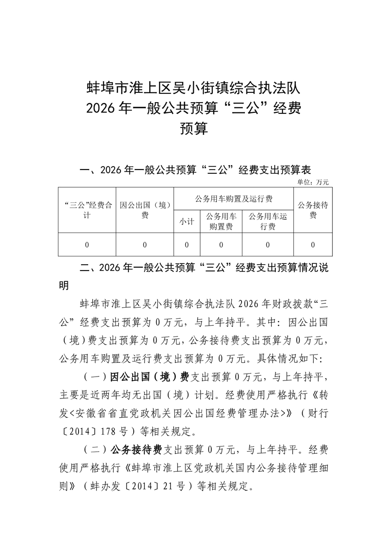蚌埠市淮上区吴小街镇综合执法队2026年单位“三公”经费安排情况