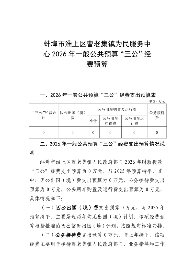 蚌埠市淮上区曹老集镇为民服务中心2026年单位”三公“经费安排情况